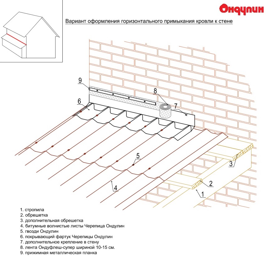 При монтаже низ фартука прибивается в каждую волну гвоздями Ондулин, а верх фартука проклеивается лентой Ондуфлеш-Супер шириной не менее 10 см.